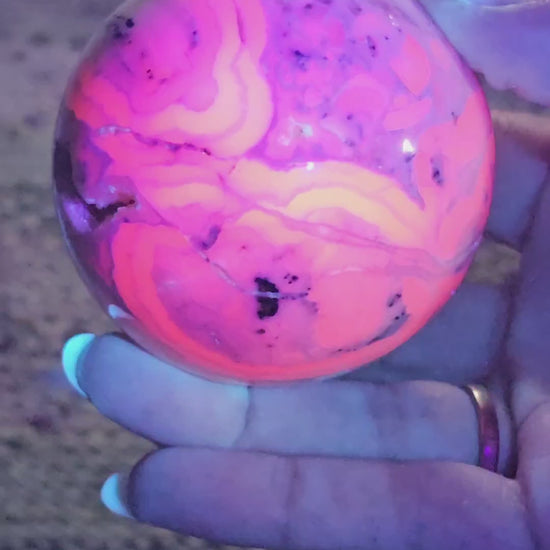 Glow up your crystal collection with this stunning Super UV Pink Mangano Calcite Sphere from Peru! This beauty absolutely glows under UV light, revealing its most magical side. Mangano Calcite is known as the stone of compassion and gentle healing energy, making it perfect for meditation spaces, altars, or anywhere you want to invite calm vibes. The smooth, polished sphere shape makes it a gorgeous display piece that catches the light beautifully. Whether you're a crystal enthusiast or just love things that sparkle, this Peruvian gem is sure to become a favorite in your collection.